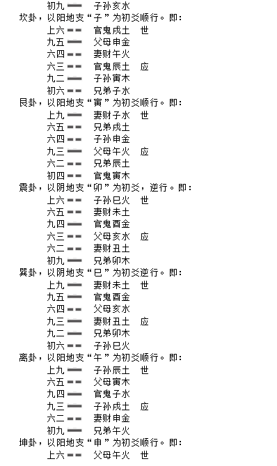 在传统《六爻》预测体系中,乾卦和震卦是以“子水”为初爻,巽卦以“丑土”为初爻,坎卦以“寅木”为初爻,离卦以“卯木”为初爻,艮卦以“辰土”为初爻,兑卦以“巳火”为初爻,然后坤卦以“未土”为初爻。