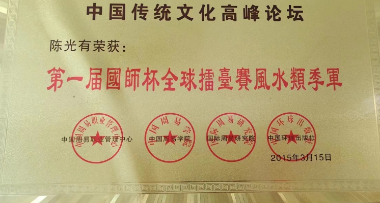 2015年3月第一届国师杯擂台赛“风水”“八字”季军奖获“当代杰出风水师。
