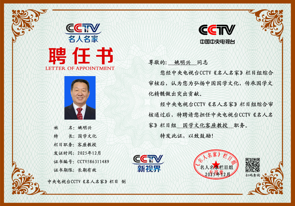 2025年12月,聘请担任中央电视台CCTV《名人名家》栏目组 国学文化客座教授 。
