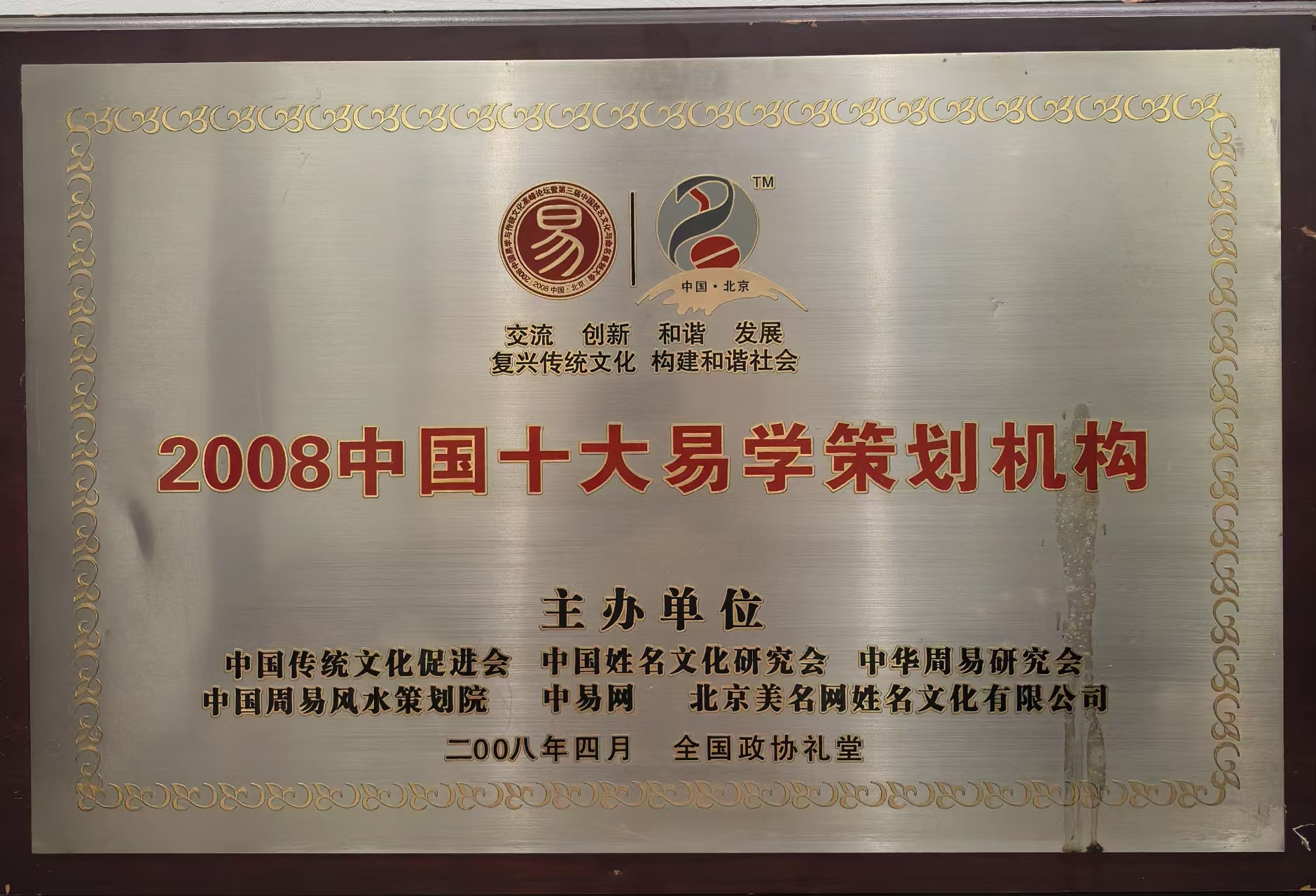 2008年,被中国易学与传统文化高峰论坛授予“中国十大杰出命名策划大师证书”。