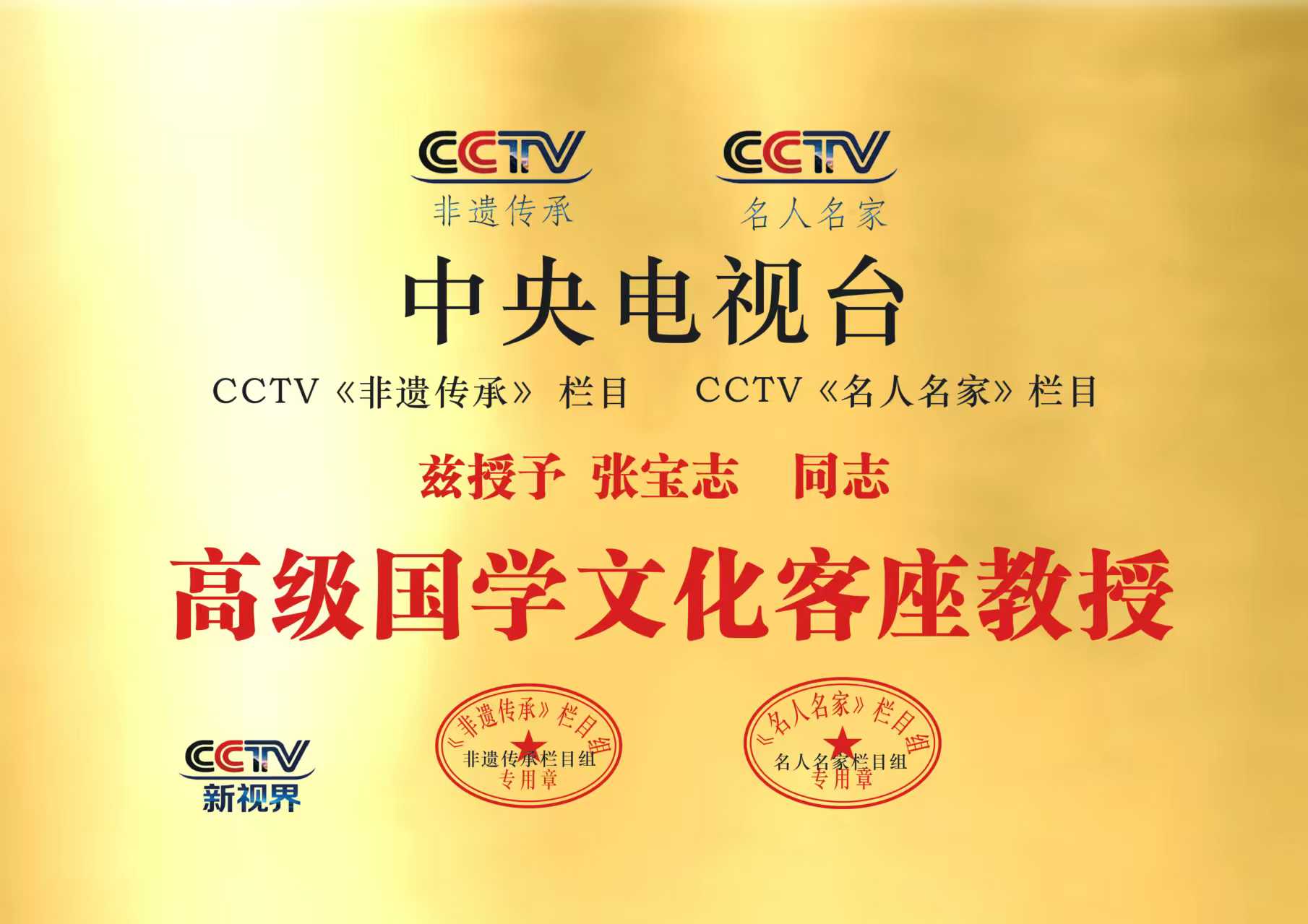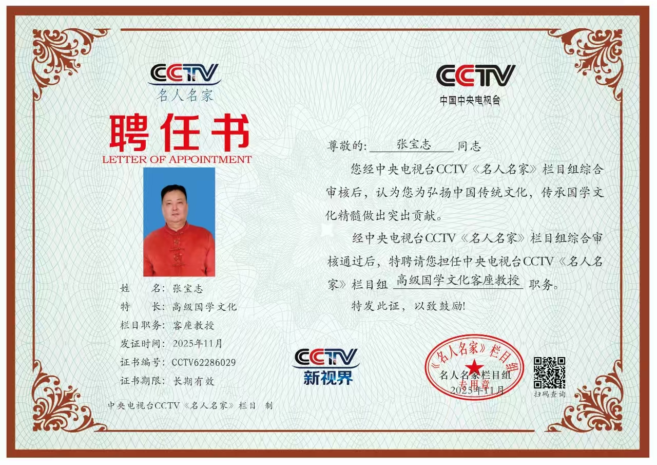2025年11月 中国中央电视台特聘请张宝志大师担任CCTV《名人名家》栏目组高级国学文化客座教授职务。