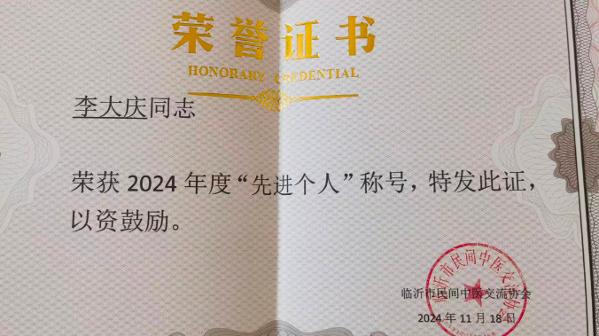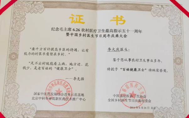李大庆秉持终身学习理念,不断提升专业素养。2014年8月,他受邀参加中华中医药学会在人民大会堂举办的“春播行动”中药外用高峰学术论坛,与各地专家交流探讨,拓宽诊疗思路。凭借过硬医术与良好口碑,2016年6月26日,他在北京被中国基层医药卫生协会授予“百姓健康卫士”称号,这份荣誉是对他医术与坚守的最好褒奖。